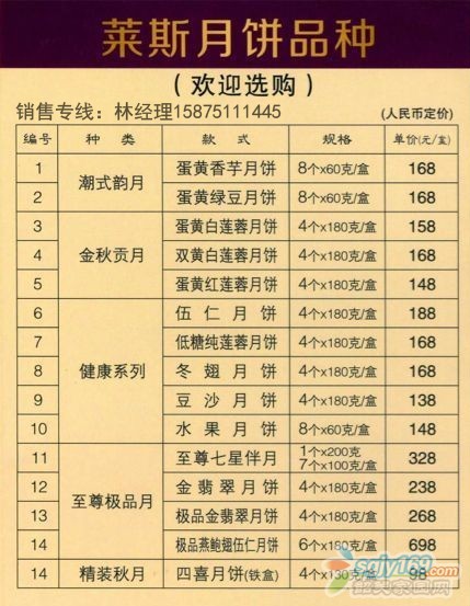五星品質(zhì),五星享受 2014年萊斯大酒店月餅券員工價(jià)熱銷(xiāo)中 歡迎廣大朋友致電咨詢(xún)購(gòu)買(mǎi) 林小姐:15875111445(歡迎朋友加微信好友了解詳細(xì)信息) QQ:413778007(空間有相關(guān)價(jià)目表及品種介紹)