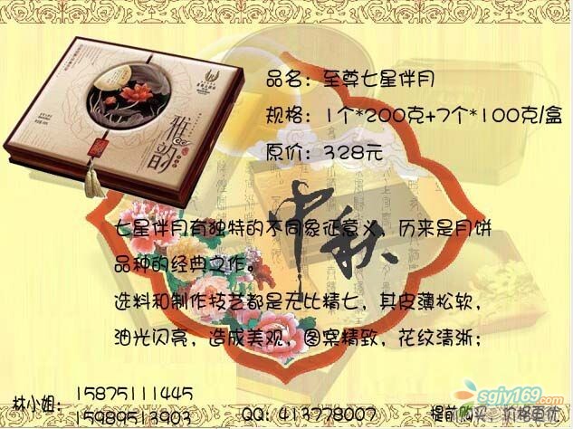 本帖最后由 Rachel 于 2014-9-4 09:17 編輯 萊斯七星伴月,月餅中的勞斯萊斯 五星品質(zhì),五星享受,是您送禮的最佳選擇! 最后23盒,售完即止,員工價(jià)優(yōu)惠全城,快快來(lái)電吧!