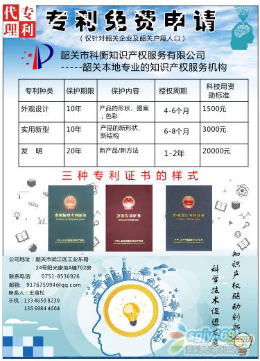 正文摘要:專(zhuān)利免費(fèi)申請(qǐng)!!!(僅對(duì)韶關(guān)企業(yè)和戶(hù)籍人口)韶關(guān)市科衡知識(shí)產(chǎn)權(quán)服務(wù)有限公司-----韶關(guān)本地專(zhuān)業(yè)的知識(shí)產(chǎn)權(quán)服務(wù)機(jī)構(gòu)地址:韶關(guān)市武江區(qū)工業(yè)東路24號(hào)陽(yáng)光康地A棟702房電話(huà):0751-8536926聯(lián)系人:王工手 機(jī) ... |